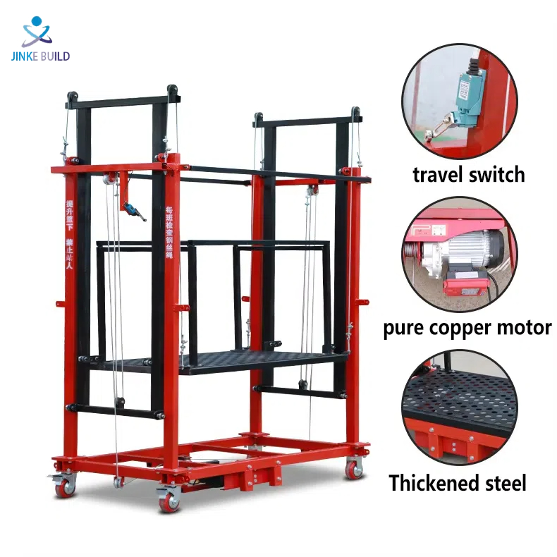 Intelligent safety protection: Equipped with dual motor drive, stepless speed lifting system, integrated tilt alarm, overload automatic locking and emergency manual descent function, maximum load 300-1200kg (models cover JKS0610/JKS1218, etc.), lifting height 6-18 meters, accurately adapt to diverse construction needs;